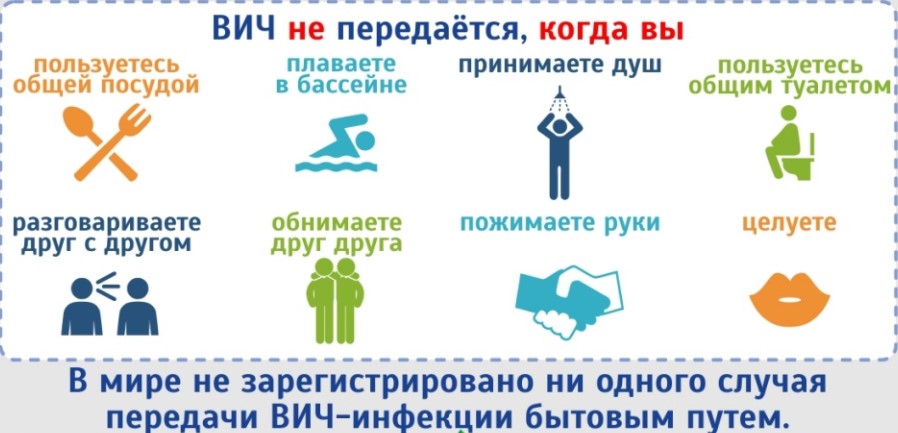 Слюна, пот и моча не содержат достаточного для инфицирования количества вируса. Поэтому невозможно инфицироваться ВИЧ при бытовых контактах – в том числе, при использовании общей посуды, полотенец и других бытовых предметов. Нет никакой опасности в совместных водных процедурах (например, в душе или бассейне). ВИЧ не передается во время объятий, поцелуев, рукопожатий. Невозможно заразиться через укусы комаров и других кровососущих насекомых, а также от животных.